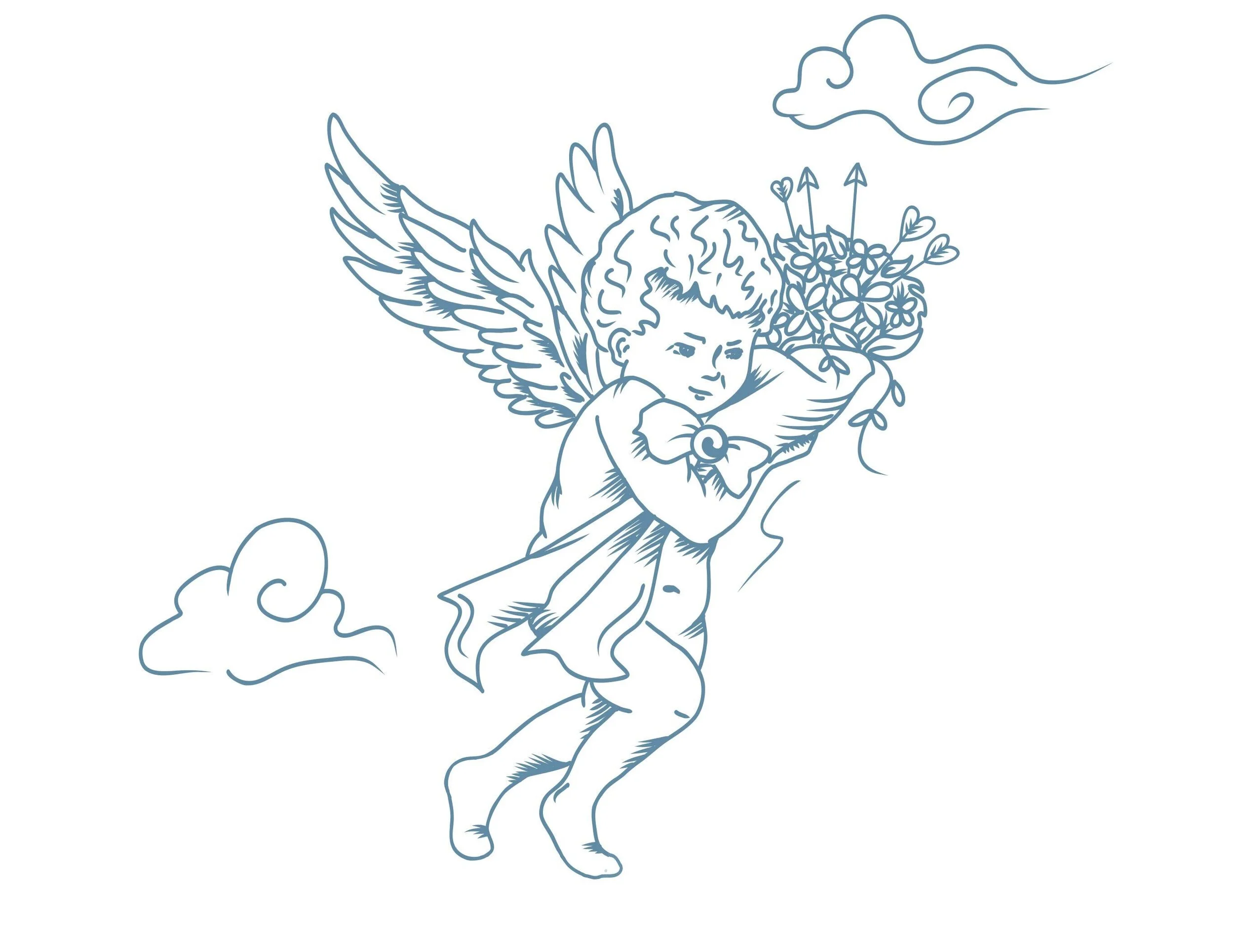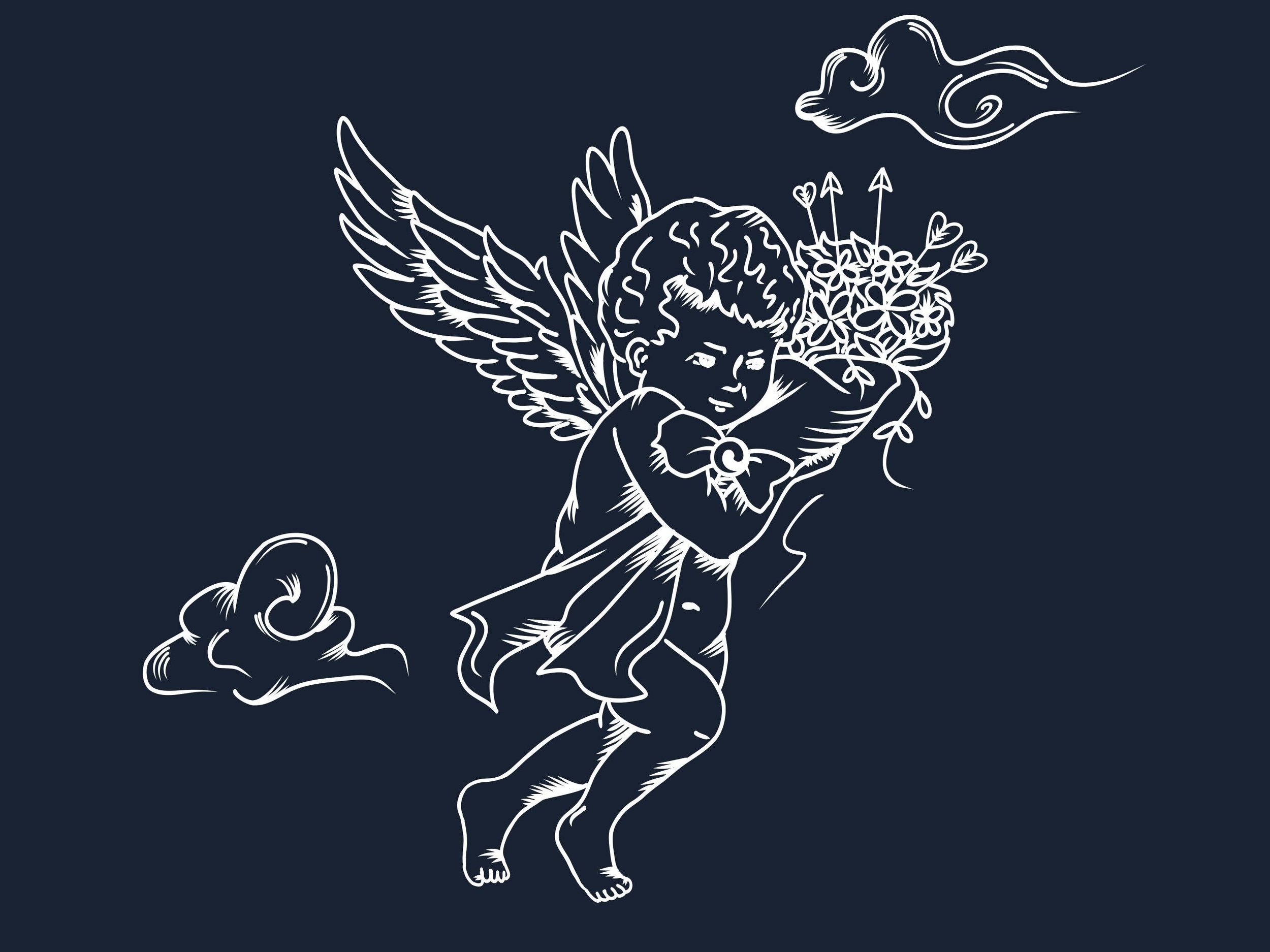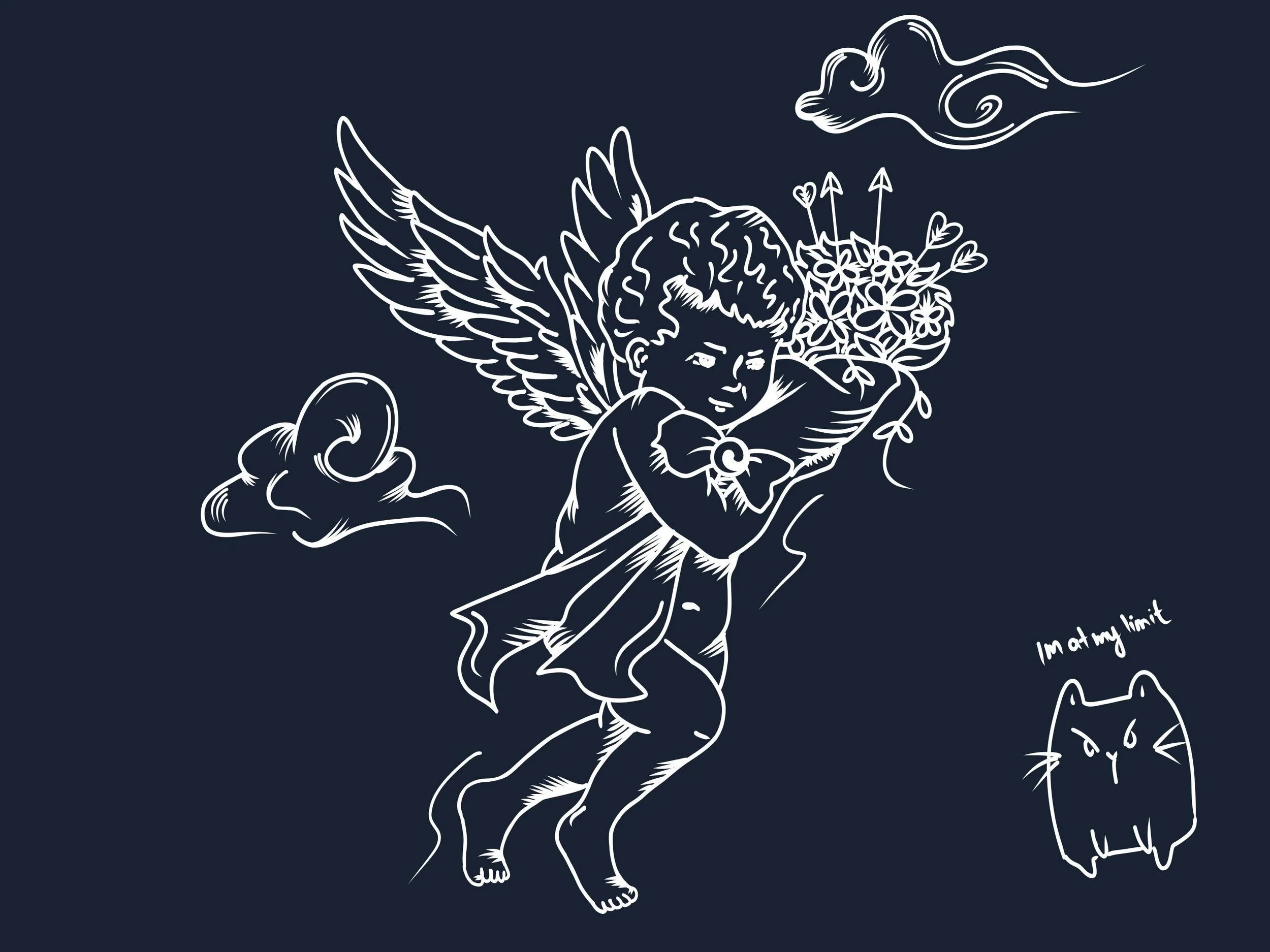 I really enjoyed drawing the cherub and the flowers. I struggled with composition the most because since the design is simple, the placement of the clouds and the positioning of the cherubs body mattered a lot as they were essential to storytelling.