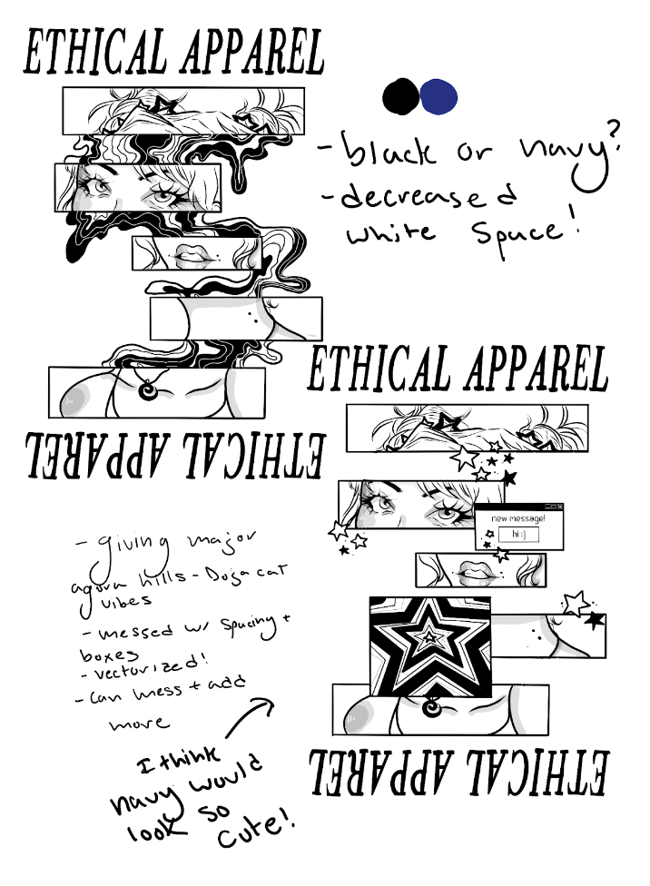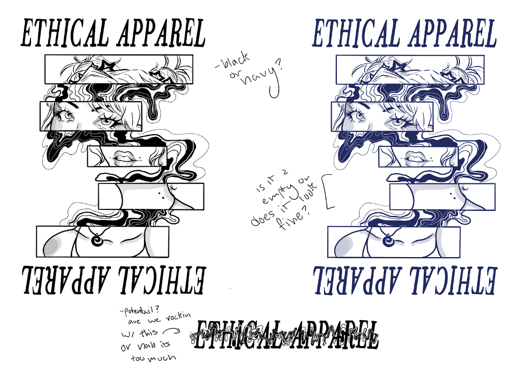 I had to work in negatives for some parts, I originally drew the piece in black before we decided to make my apparel a darker color. So i had to figure out how to make my design translate on a dark background, it took a while but eventually, I figured it out which was nice.