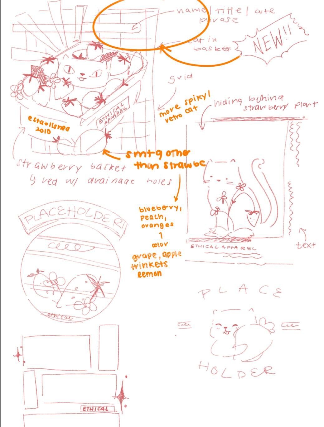 I usually do cute references. With my first draft, Sarah and Tiff (Vice Presidents of Design Department) were like, “It’s too cute!” so I had to change the cat around. I did a lot of variations of the fruits, the cat, and basket. I had to turn them around to make it into something more edgy. That’s why I shifted to Japanese vintage streetwear.