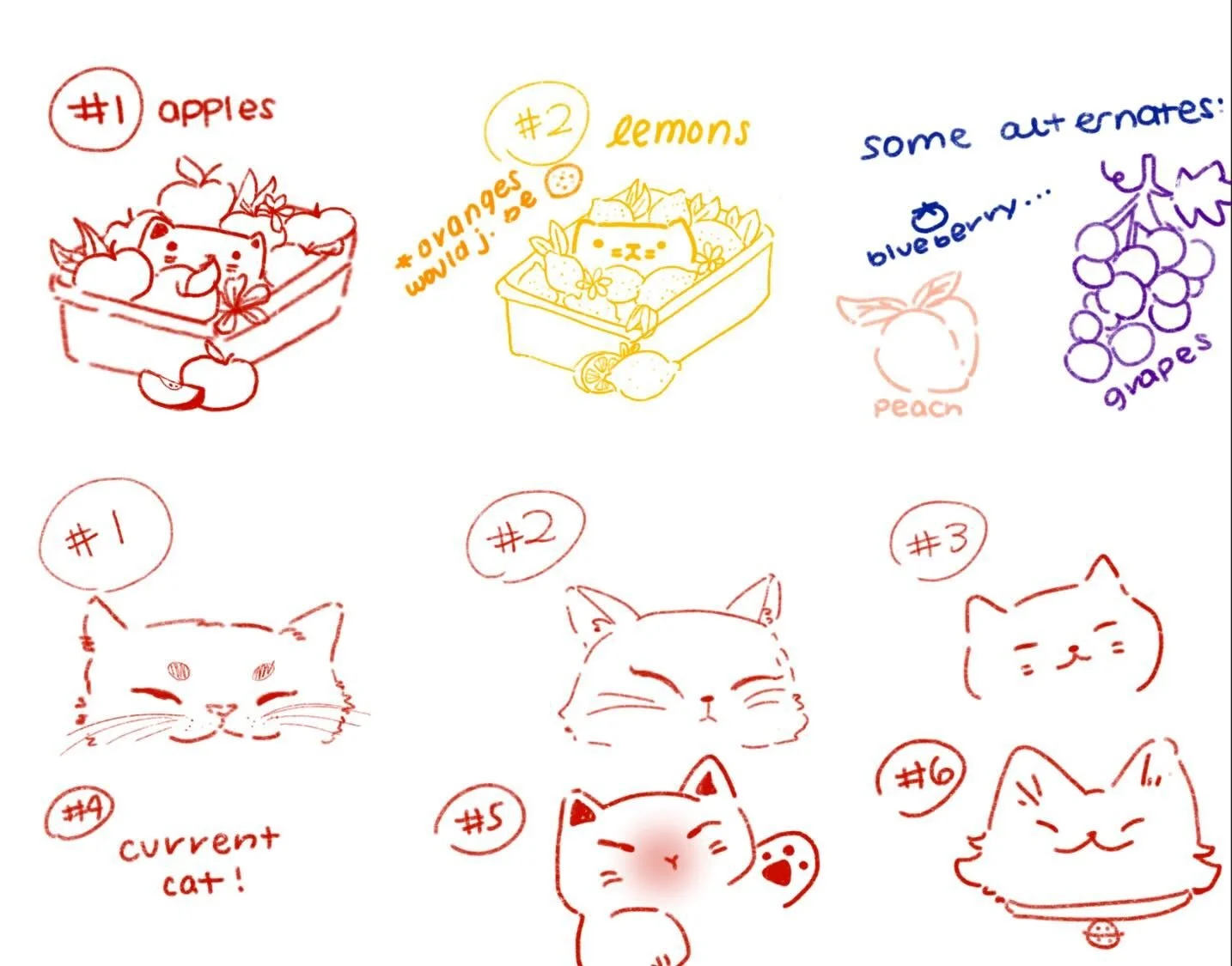 For drawing style, I’ve been drawing for a while—I think since I was in 7th or 8th grade. I got Procreate on an iPad and went from there. I like a lot of anime, cute and round things, like animals, especially cats. I also sketch a lot in general.