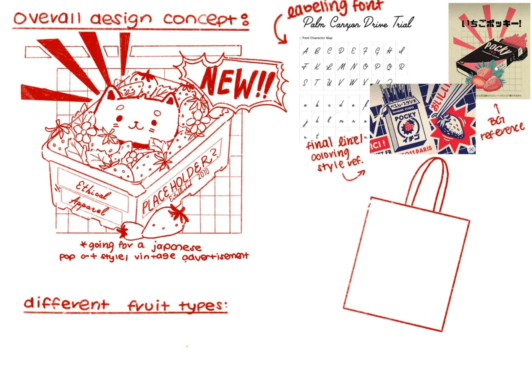 I honestly didn’t think too much about the overall theme itself. The general design theme was “vintage revival,” so I thought of doing a vintage fruit box theme on a tote bag. A lot of packaging for fruit is plastic now, so I thought about farmer’s market or vintage packaging, like wooden crates or green paper-cardboard cartons. I decided to add a cat for visual interest, which you know Sailor Moon? I based the vibes on the Sailor Moon cat.