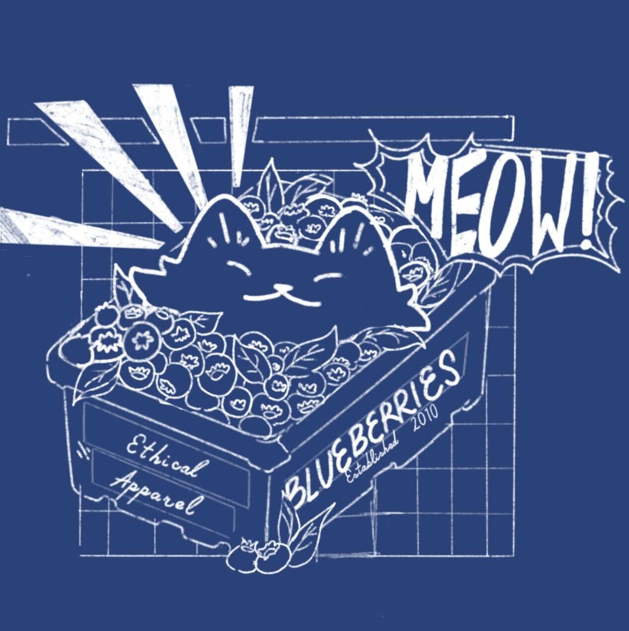 The final design of the cat is still cute but not fluffy in the same way. The blueberries were difficult. Originally, I wanted to do strawberries because of their general popularity as a design, and blueberries don’t have a similar grab. They’re very small, round, and a lot of feedback I got was that they made the background look too flat. It was difficult to balance the texture and interest of the piece without looking messy, so I had to navigate designing something not as popular or interesting.
